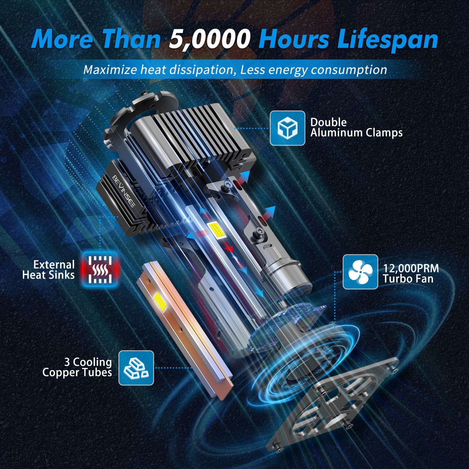 [More Efficient Cooling Capacity] Top-grade space aluminum housing+triple vacuum heat pipe+fin heat sink+12,000RPM turbo fan, provide maximize heat dissipation for the bulb housing. Less energy consumption for brighter light.