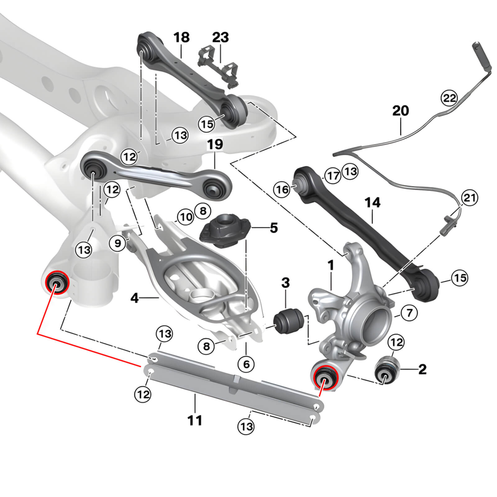 The BMW E9X rear suspension is very complex, with five links on each side. One of them, the trailing arm, connects the subframe to the main axle via rubber bushings.